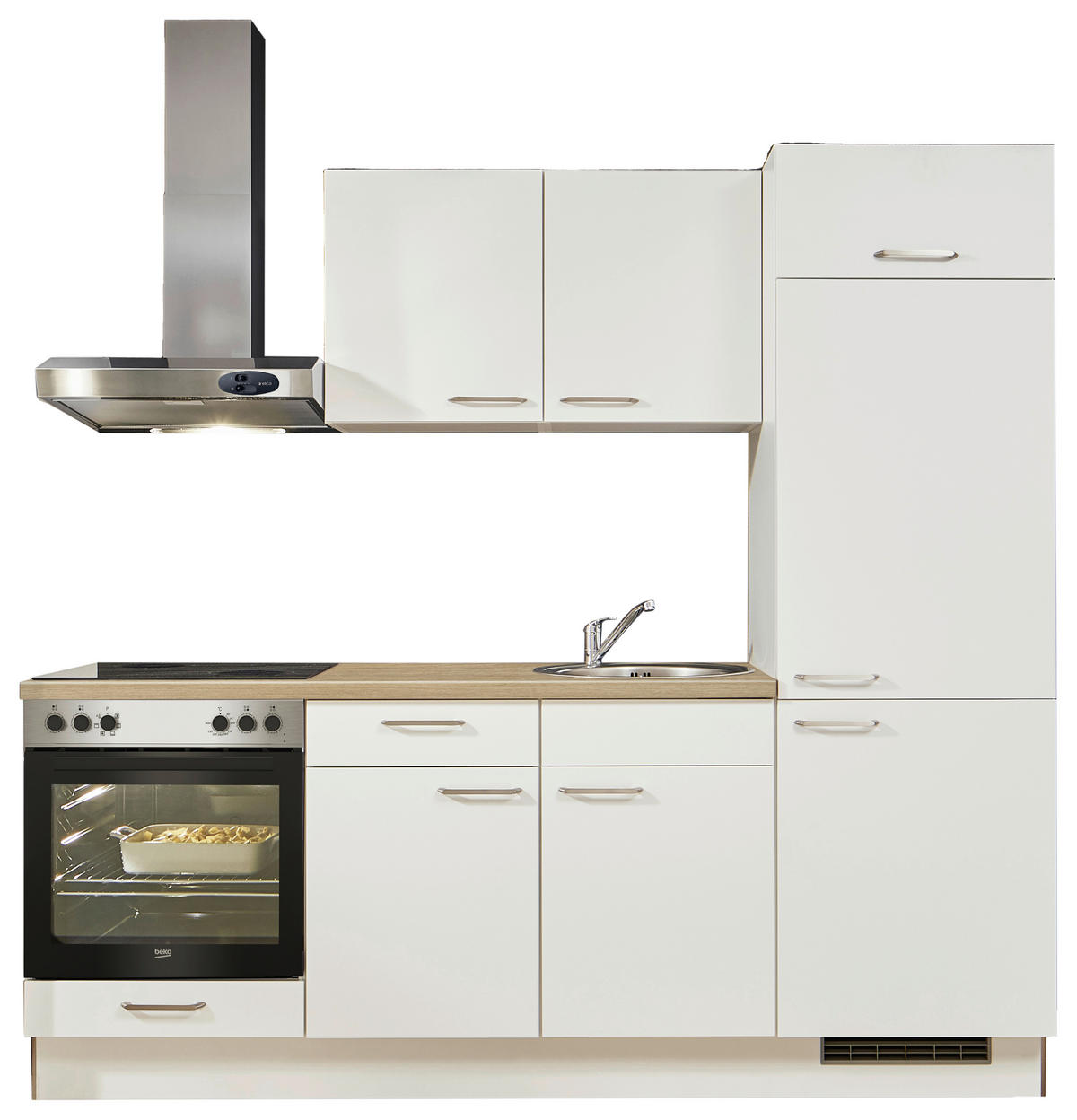 Nicht im Lieferumfang enthalten: Armatur, Besteckeinsatz, E-Geräte, Nischenrückwand, Spüle, Dekoration, Anschlussset