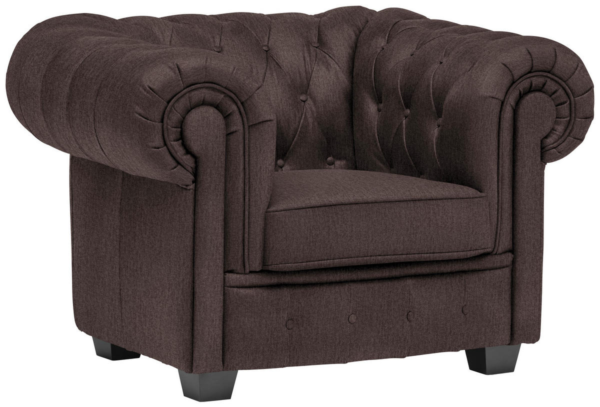 Sehenswerter Hingucker Die markante Farbgebung in Dunkelbraun passt in unterschiedlichste Einrichtungsstile. Standfest und stylish vervollständigen die eckigen Füße aus lackierter Kiefer in Wengefarben das Design. Als treue Begleitung für wonnige Time-outs daheim gesellt sich dieser dunkelbraune Chesterfield-Sessel mit Webstoff-Bezug gerne zu Ihnen! Informationen zu separat bestellbarem Equipment oder weiteren verfügbaren Varianten finden Sie in den Produktdetails unter "Produktvorteile/Besonderheiten". Gerne können Sie sich diesbezüglich auch über das