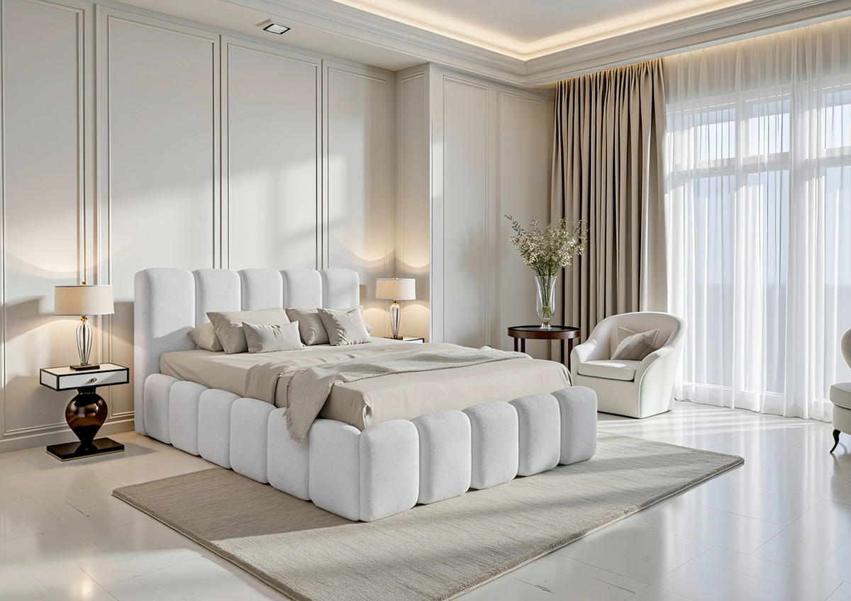 Polsterbett (180 x 200 cm) in Perlmuttfarben mit Bettkasten: einfach komfortabel