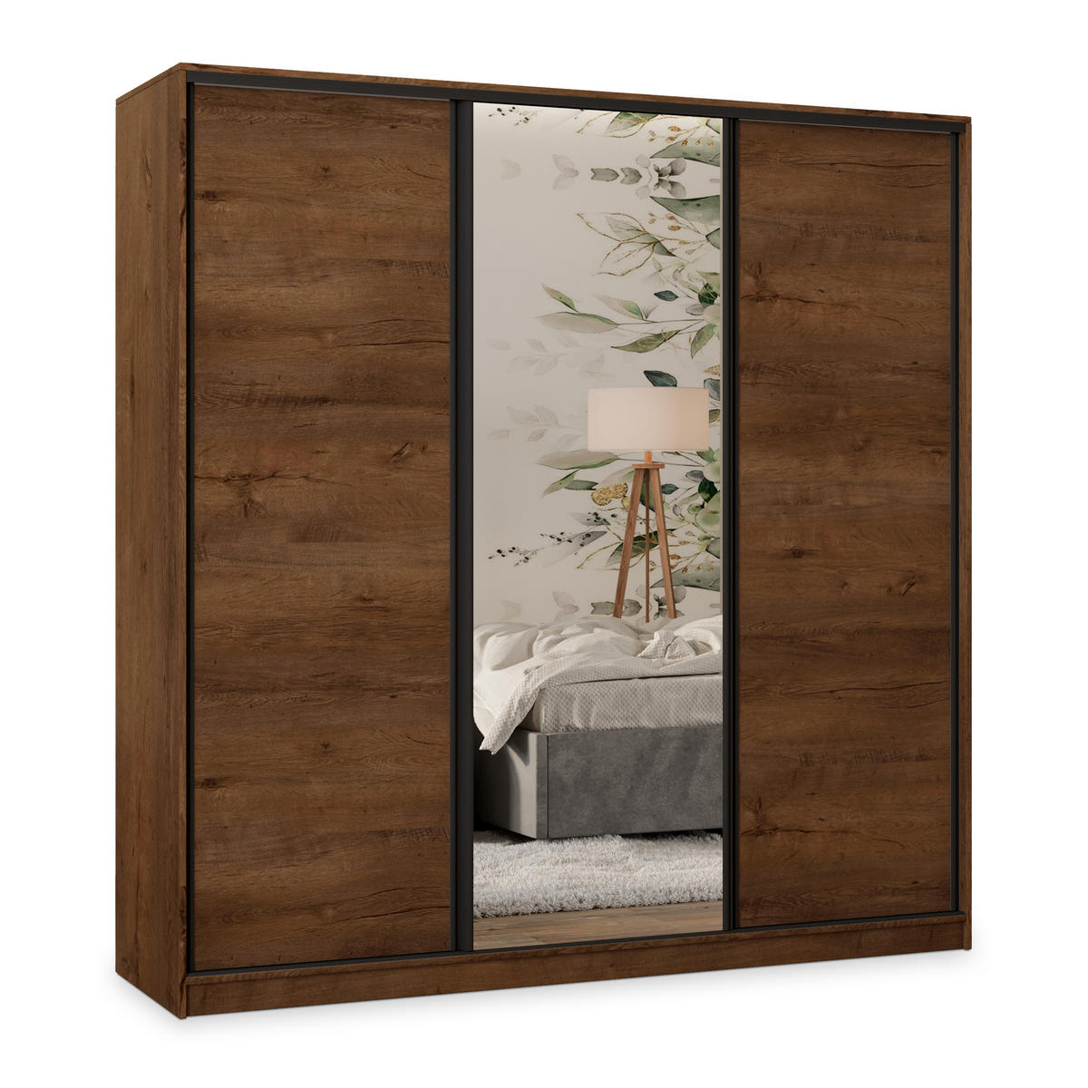 SCHWEBETÜRENSCHRANK TARI 180/205/58 cm 3-türig mit Spiegel und Schubladen Eiche Lefkas - Eichefarben/Schwarz, Holzwerkstoff (180/205/58cm) - MASSENOMASSENO
