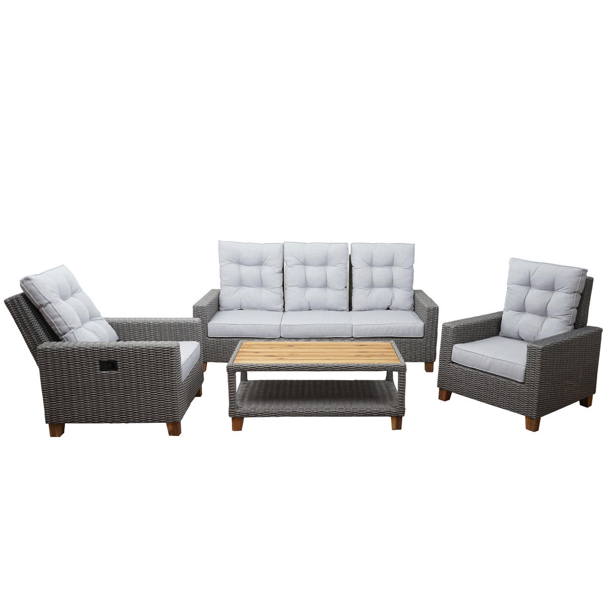 - Materialzusammensetzung: Geflecht: Poly-Rattan Gestell: Pulverbeschichteter Stahl Tischplatte und Beine: Akazienholz Bezug: Stoff/Textil (100% Polyester)