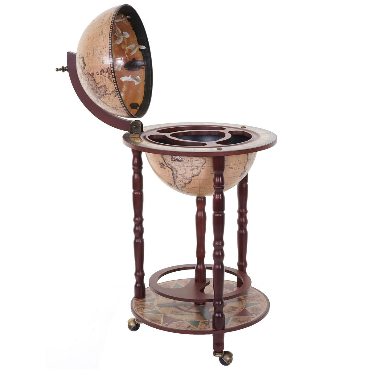 Diese extravagante Globus-Bar ist ein absoluter Hingucker und praktisch noch dazu: Sie lässt sich ganz einfach mit nur einem Handgriff öffnen, so dass Sie stets leichten Zugang zu allen benötigten Dingen haben und bietet ausreichend Platz, um mehrere Gläser und Flaschen darin zu verstauen. Durch die zusätzliche Ablage im unteren Bereich können noch weitere Flaschen untergebracht werden, so dass immer für ausreichend Nachschub gesorgt ist. Auch optisch hinterlässt die Bar einen bleibenden Eindruck: Die Außenseite ist mit einer antiken Weltkarte verziert, während auf der Innenseite ein Gemälde abgebildet ist. Und zu guter Letzt können Sie Ihren Wein im Zimmer Ihrer Wahl genießen, da die integrierten Rollen für Mobilität sorgen.