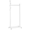 Durch die Rollen kann er leicht bewegt werden. Die untere Ablage eignet sich für Schuhe oder Taschen, die Stange für Kleiderbügel und auch Haken zum schnellen "Drüberwerfren" von Dingen sind ideal.