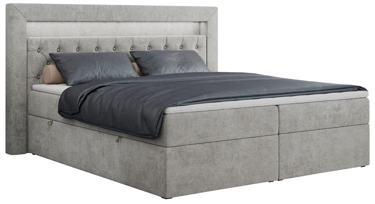 - Besonderheiten: Bettkasten, Federkernmatratze, Matratze in verschiedenen Härtegraden erhältlich, gepolstertes Kopfteil, Topper durchgehend, Kingsize, Beleuchtung