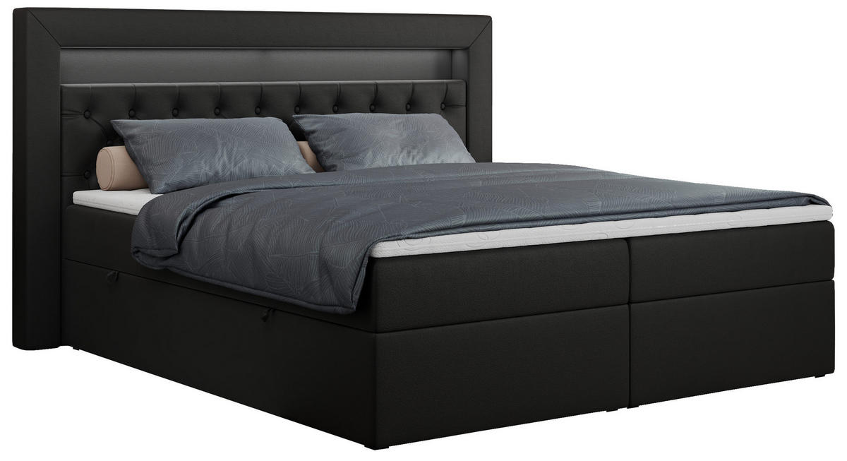 - Besonderheiten: Bettkasten, Federkernmatratze, Matratze in verschiedenen Härtegraden erhältlich, gepolstertes Kopfteil, Topper durchgehend, Kingsize, Beleuchtung
