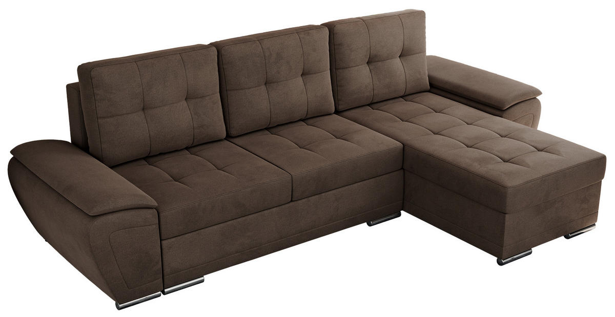 Abgerundete Armlehnen und gesteppte Sitzfläche und Kissen verleihen dem Sofa einen exklusiven Look. Die stabilen, schlanken Metallfüße verleihen der Wohnlandschaft einen Hauch von Leichtigkeit und unterstützen zugleich die Standfestigkeit. Mit dem Schlafsofa mit Bettkasten UMBRIA holen Sie sich ein stilvolles Möbelstück ins Wohnzimmer, das Komfort und Design perfekt miteinander vereint und vielseitige Gestaltungsmöglichkeiten bietet.