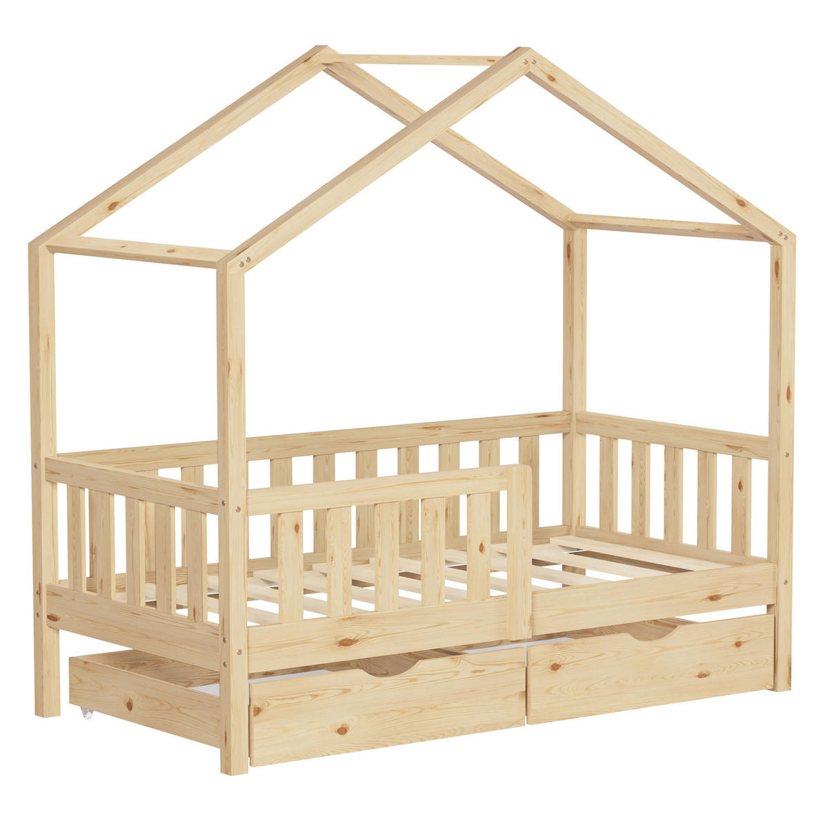 ML-DESIGN HAUSBETT 70x140 cm Natur aus Kiefernholz mit 2 Schubladen und Rausfallschutz