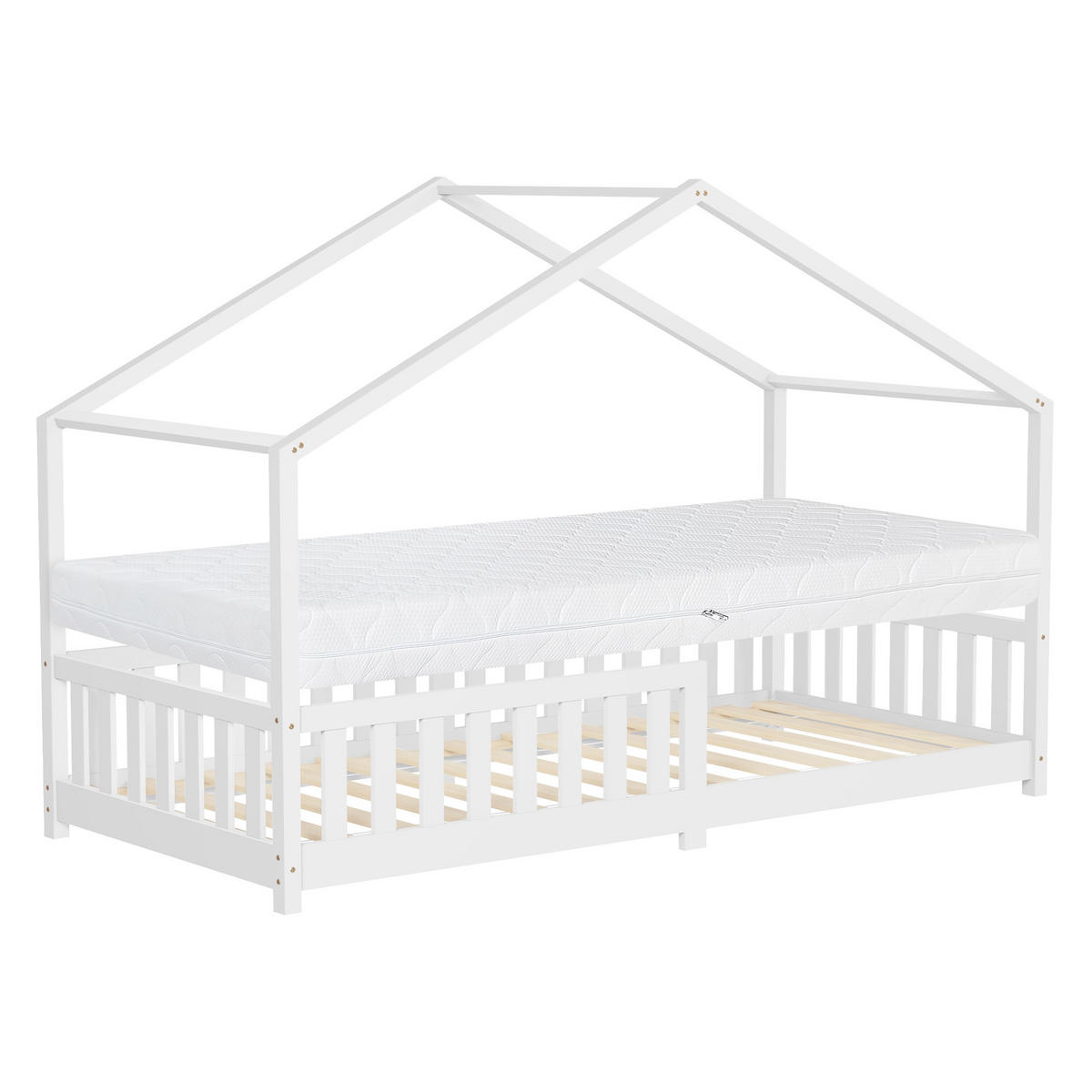 Dieses stilvolle Kinderbett in Hausform verwandelt jedes Kinderzimmer in eine behagliche Wohlfühloase mit Spielcharakter. Das offene Holzgestell in Form eines Hausdachs lädt nicht nur zum Schlafen ein, sondern auch zum fantasievollen Spielen und Entspannen. Gefertigt aus massivem Kiefernholz und ausgestattet mit einem stabilen Lattenrost aus Sperrholz, bietet das Bett eine langlebige und sichere Schlafstätte für Kinder. Mit einer großzügigen Liegefläche von 90 x 200 cm eignet es sich ideal für Kinder, Jugendliche oder sogar junge Erwachsene. Ob als Rückzugsort, Spielhaus oder klassisches Bett – dieses Modell vereint kindgerechtes Design mit hoher Funktionalität.Mit dieser Kaltschaummatratze bekommst du den wohlverdienten erholsamen Schlaf, den du brauchst. Die Kaltschaummatratze bietet eine gesunde Unterstützung für Kopf, Nacken, Rücken und Beine. Der Matratzenkern ist aus hochwertigem, hypoallergenem Kaltschaum und ist somit bestens geeignet für Allergiker. Sollten Verunreinigungen auf der Matratze geschehen, kannst du den Steppbezug mithilfe des Reißverschlusses einfach abnehmen und in die Waschmaschine geben.Der Bezug der Matratze ist abnehmbar und waschbar. Mittels eines Reißverschlusses an einer der beiden Kurzseiten kann der Bezug geöffnet und problemlos abgezogen werden. Der Bezugsstoff besteht zu 100 % aus Polyester.Die hochwertige Komfortschaummatratze ist gleichermaßen für Betten mit den Maßen 90 cm x 200 cm geeignet. Beide Liegeseiten sind mit der gleichen Stützkraft ausgestattet, so ist die Matratze beliebig drehbar und wendbar.Schadstoff geprüft: Diese Matratze wurde mit dem Oeko-Tex Standard 100 ausgezeichnet. Das heißt die Matratze besteht aus schadstofffreien Materialien und ist somit zu 100% gesundheitlich unbedenklich.Deine Vorteile im ÜberblickHausdach-Design: Ein optischer Hingucker und kreativer Spielort zugleich.Massives Holzgestell: Aus stabilem Kiefernholz für zuverlässige Standfestigkeit.Lattenrost inklusive: Aus robustem Sperrholz – direkt einsatzbereit.Für Matratzen 90 x 200 cm: Auch für größere Kinder und Jugendliche geeignet.