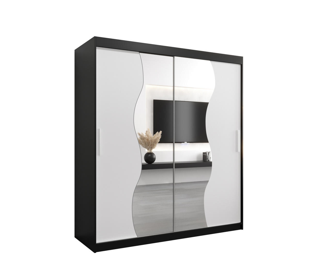 Schrankabmessungen: Breite 180 cm, Höhe 200 cm, Tiefe 62 cm. Türtyp: Schiebetür. Anzahl der Türen: 2 Türen. Kleiderschrank mit Spiegel. Material: Korpus und Front aus 16 mm dickem Laminat, Aluminiumführungen, Metallstangen, Kunststoffgriffe, Kanten aus 0,5 mm starkem PVC-Furnier.
