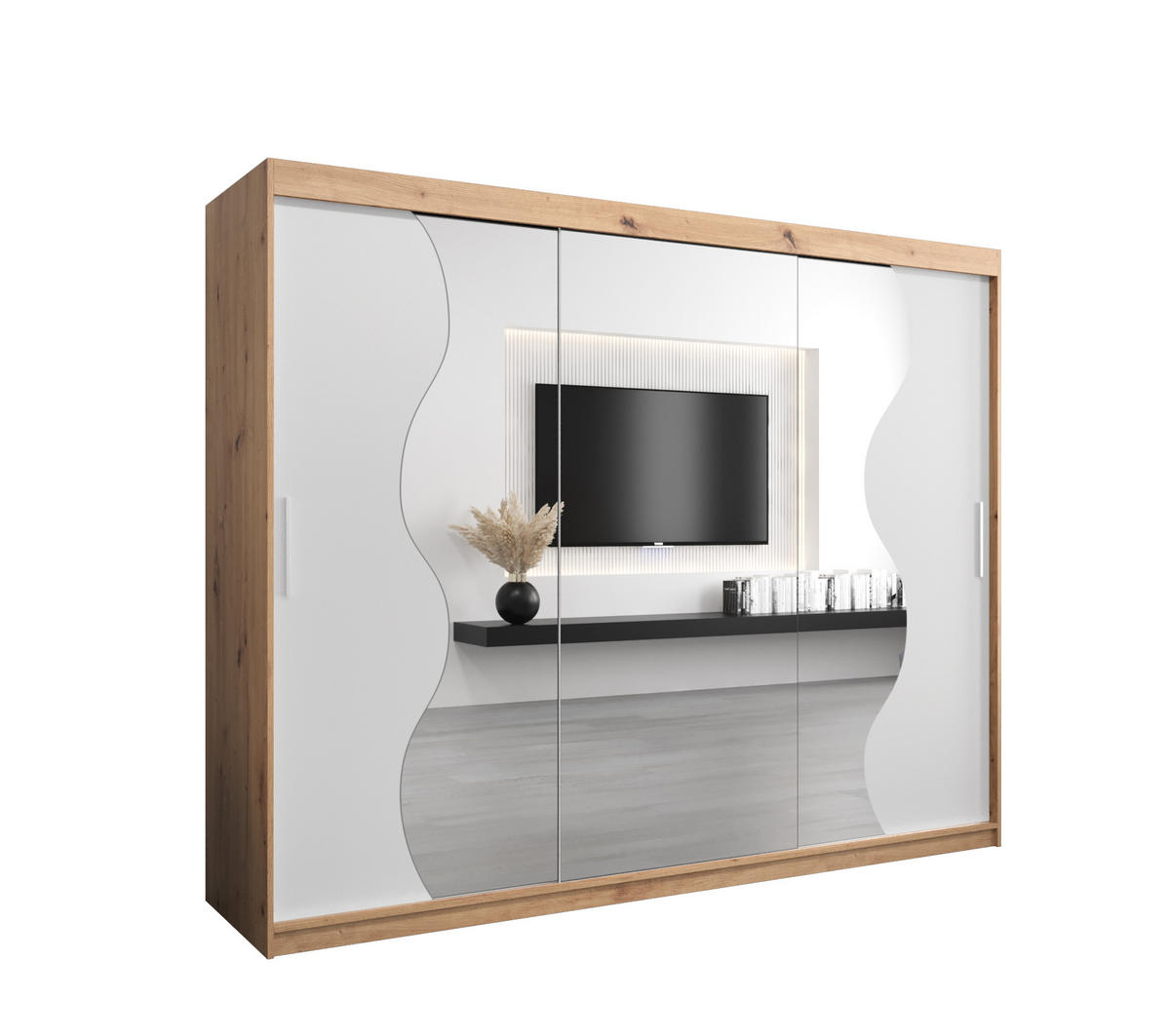 Schrankabmessungen: Breite 250 cm, Höhe 200 cm, Tiefe 62 cm. Türtyp: Schiebetür. Anzahl der Türen: 3 Türen. Kleiderschrank mit Spiegel. Material: Korpus und Front aus 16 mm dickem Laminat, Aluminiumführungen, Metallstangen, Kunststoffgriffe, Kanten aus 0,5 mm starkem PVC-Furnier.