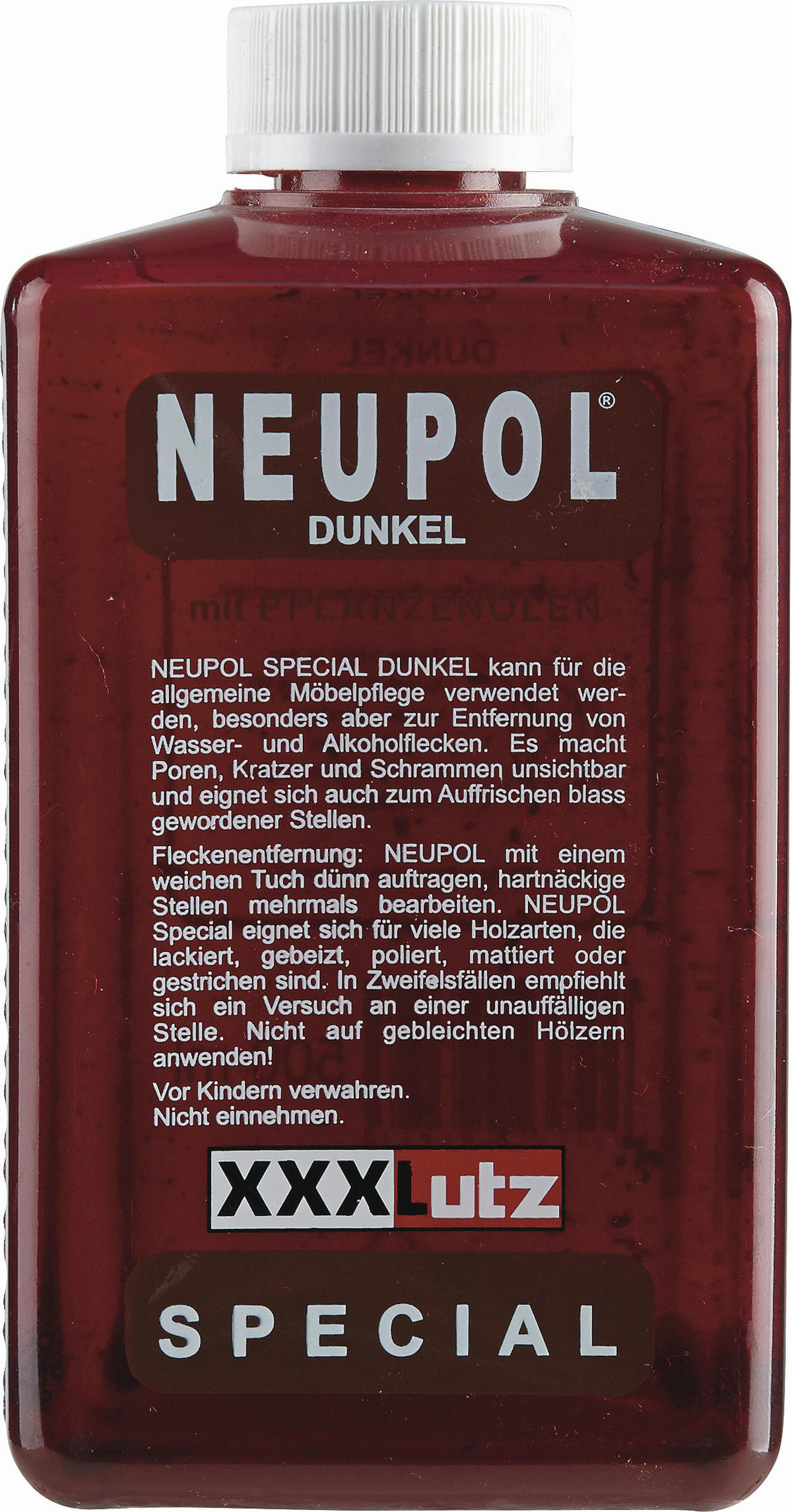 NEUPOL SPECIAL DUNKEL kann für die allgemeine Möbelpflege verwendet werden, besonders aber zur Entfernung von Wasser- und Alkoholflecken. Es macht Poren, Kratzer und Schrammen unsichtbar und eignet sich auch zum Auffrischen blass geworderner Stellen.