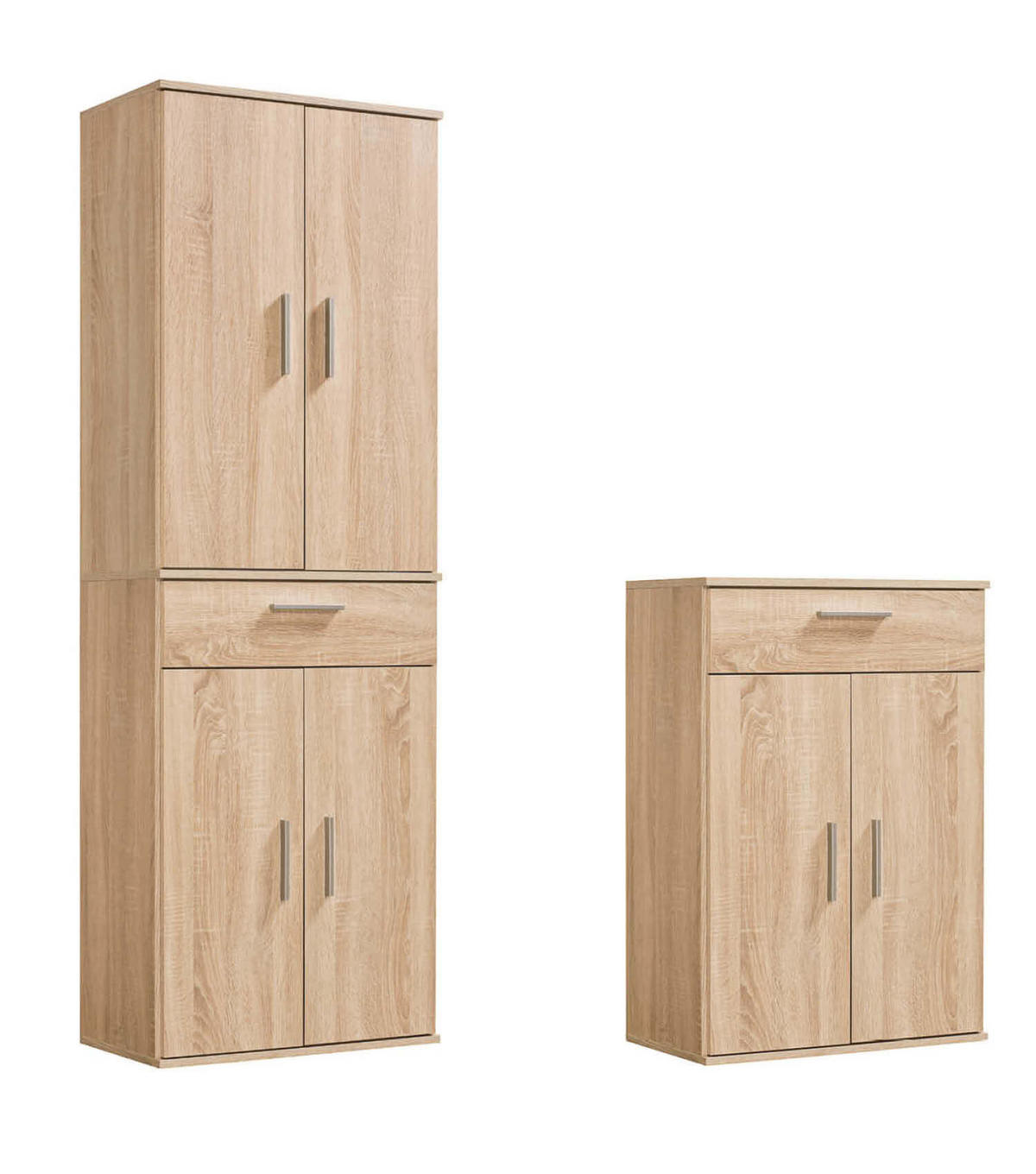 - Materialzusammensetzung: Korpus aus Spanplatte mit beständiger Kunstharzbeschichtung und push-to-open Öffnungsfunktion oder dezenten Kunststoffgriffen in silber-grau beim Schrank 'Der Lange'.