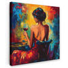 Ein malerisches Bild einer Frau in einem roten Kleid, die mit einem Glas Wein in der Hand sitzt. Der Hintergrund ist eine Explosion aus warmen und kühlen Farben, die ein lebendiges und stimmungsvolles Bild ergeben.