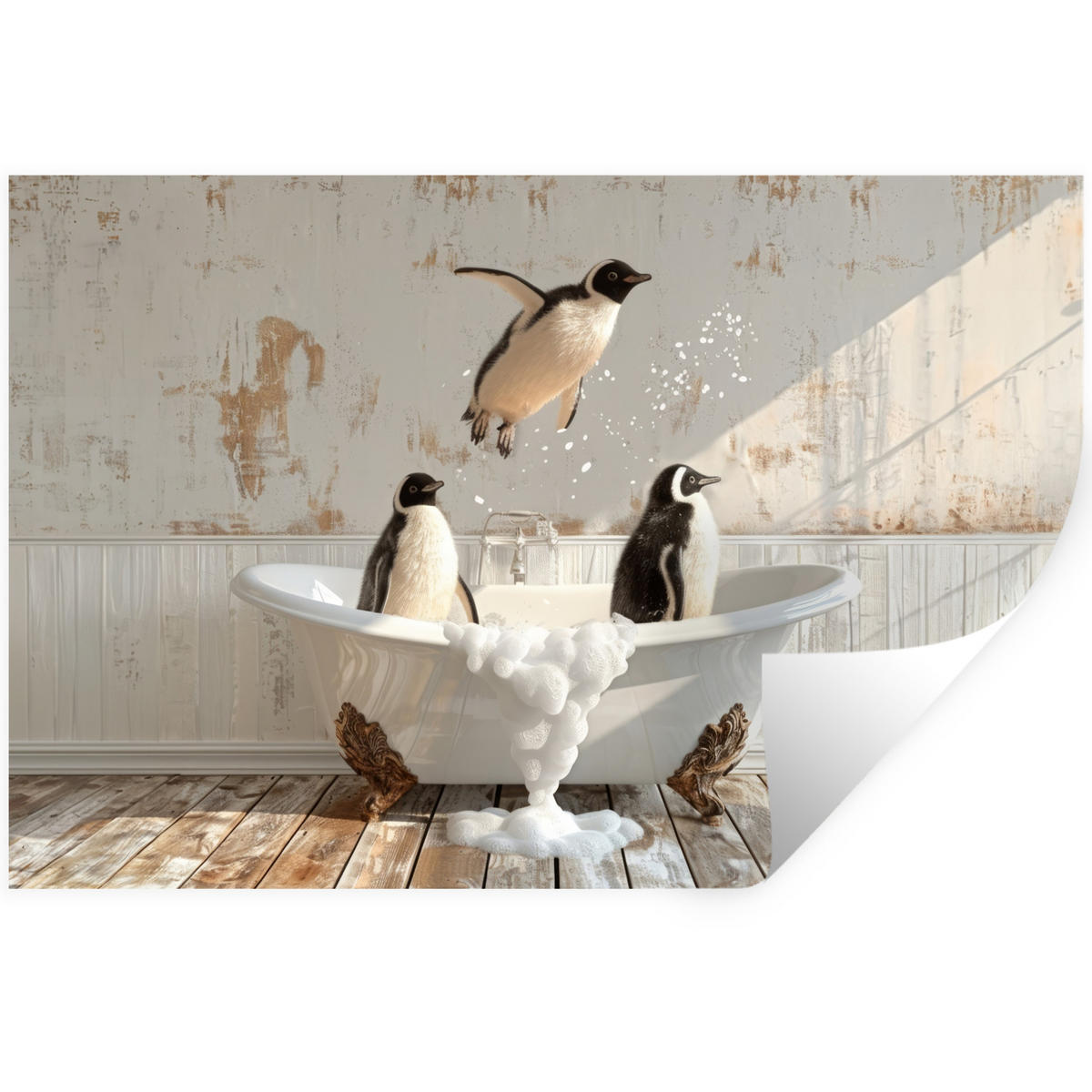 Über das Bild Drei Pinguine in einer alten Schaumstoffbadewanne.
