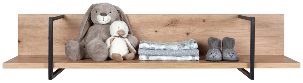 Auf diesem Wandboard in Eichefarben bewahren Sie Spielzeug und Kleidung für Ihren Schatz auf, die schnell griffbereit sein soll. In der Nähe der Wickelkommode oder des Bettchens an der Wand angebracht, schaffen Sie im Nu zusätzliche Ablagemöglichkeiten. Auch das Design kann sich sehen lassen: Die folierten Oberflächen kreieren einen rustikalen Look. Mit diesem Wandboard in Eichefarben (B x H x T: ca. 120 x 19,2 x 19,5 cm) zieht ein zuverlässiger Begleiter für die ersten Lebensjahre Ihres Spatzes bei Ihnen ein!