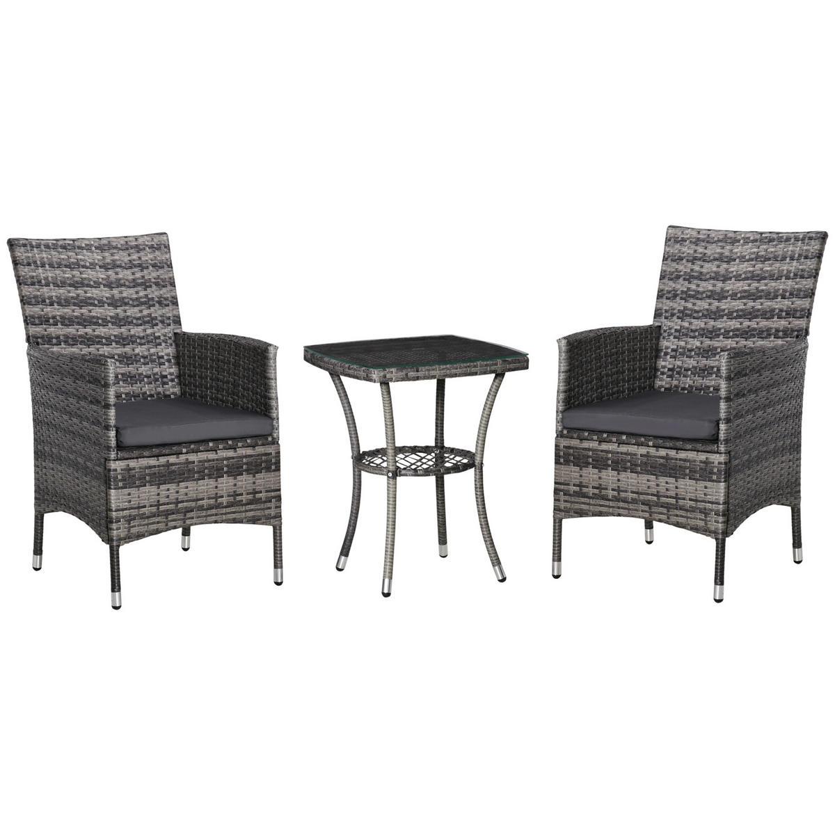 Mit diesem Balkonmöbel-Set für zwei Personen von Outsunny bringen Sie Stil und Komfort auf Terrasse und Bakon. Das Rattan Lounge Set in Rattan-Optik besteht aus zwei Stühlen und einem Tisch mit gehärteter Glasplatte. Im Lieferumfang enthalten sind auch zwei dicke Polsterkissen mit waschbarem Bezug. Mit der Sitzlounge können Sie es sich bei einem Kaffee oder Wein so richtig gemütlich machen.