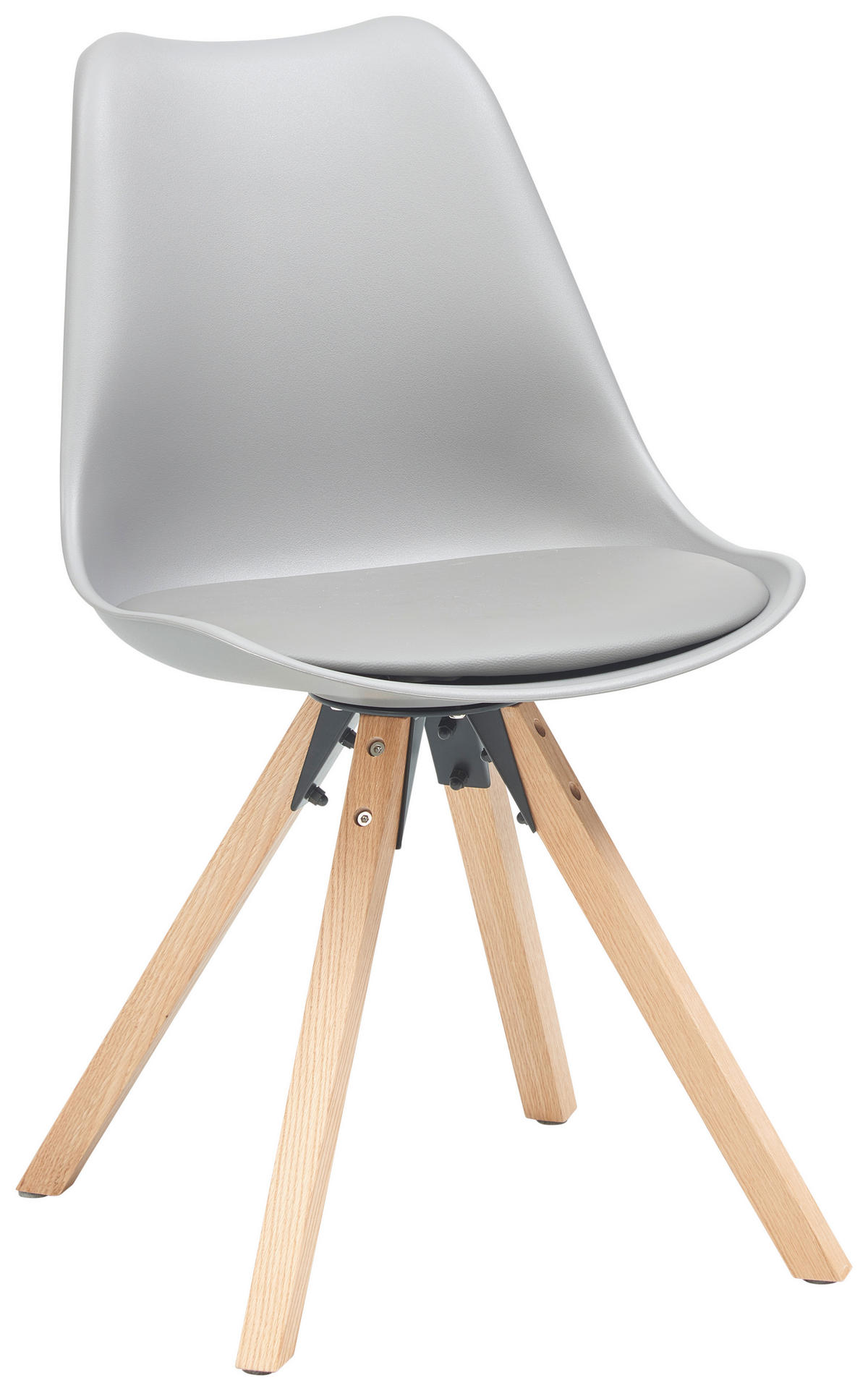 Einen stabilen Stand hat der maximal bis ca. 120 kg belastbare Esszimmerstuhl durch das vierbeinige Stativgestell aus Eiche massiv mit lackierter Oberfläche, dessen individuelle Maserung gut sichtbar ist. Dank der Schaumstoffpolsterung der Sitzfläche haben Sie es auf Ihrem neuen Stuhl im Lederlook in Grau stets bequem. Setzen Sie auf nordisch inspirierte Wohnlichkeit!
