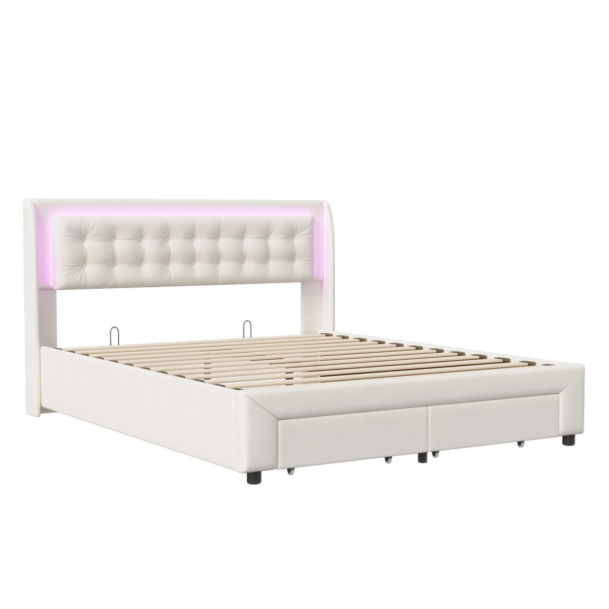 - Moderne RGB-LED-Beleuchtung: Das Kopfteil ist mit verstellbaren RGB-LED-Lichtern ausgestattet, die über eine Fernbedienung oder App gesteuert werden können. So können Sie Ihr Schlafzimmer mit stimmungsvoller Beleuchtung für entspannte Nächte versehen.