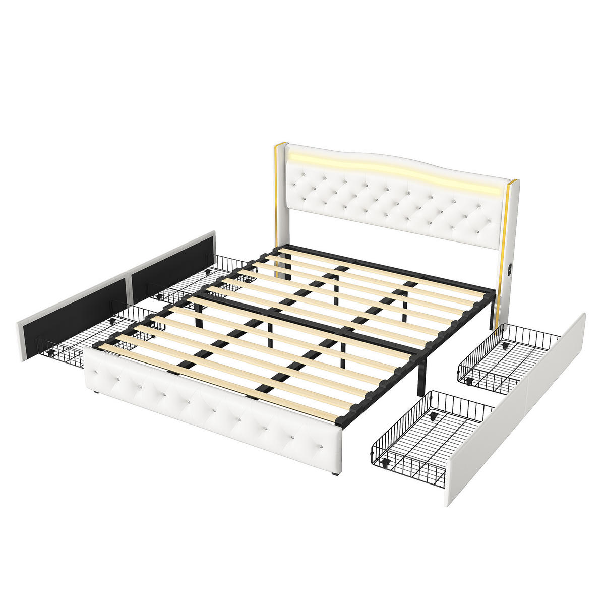 - Farbige LED-Lichtleiste mit Fernbedienung: Das Kopfteil des Bettes ist mit einer farbenfrohen LED-Lichtleiste ausgestattet, die mit Silikonstreifen abgedeckt ist, um gleichmäßiges, nicht blendendes Licht zu bieten. Die Lichtleiste kann mit einer Fernbedienung