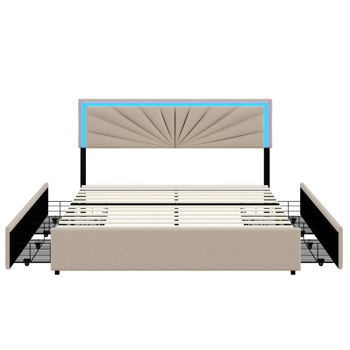 Dieser Polsterbett ist modern, in den Größe 140*200 und 160*200 erhältlich und mit LED-Streifen versehen, die für ein stimmungsvolles Ambiente sorgen. Es besteht aus einem Kopfteil und einem Schubladenboden mit einem Lattenrost. Die Schubladen können
