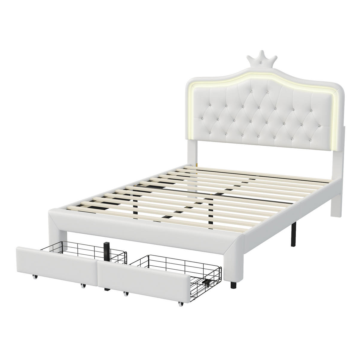 LED-Lichtleisten am Kopfende des Bettes mit Farbwechsel für einen modernen Touch und zusätzliche Lichtquelle. Die Schublade am Fußende des Bettes ermöglicht die Aufbewahrung verschiedener Gegenstände.