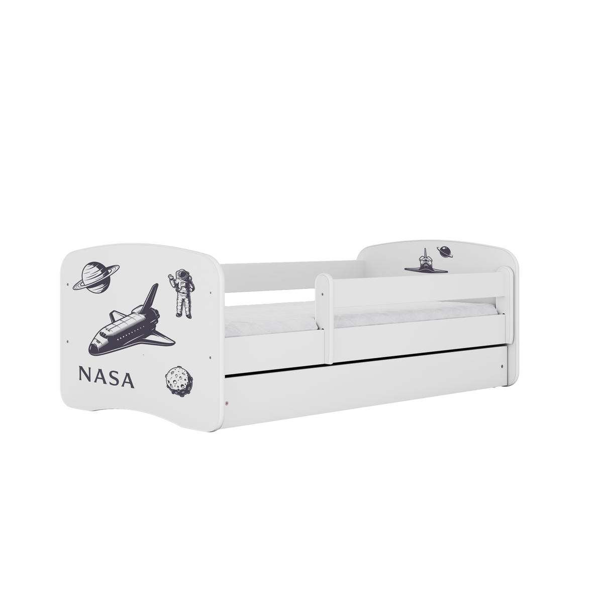 Das Kinder-/Jugendbett (160/80 cm) in Weiß mit dem Motiv „NASA“ von Raumhirsch bringt eine moderne, gemütliche Atmosphäre in ein Kinder- oder Jugendzimmer. Mit seinem markanten Design und dem geschwungenen Kopf- und Fußteil schafft es eine beruhigende Umgebung, die durch die neutrale Farbgebung noch verstärkt wird.Besonders praktisch ist die abnehmbare Schutzschiene, die sowohl rechts als auch links angebracht werden kann und für die Sicherheit kleiner Kinder sorgt. Das Bett verfügt außerdem über eine unterteilte Schublade, in der Bettwäsche, Kissenbezüge und Decken verstaut werden können – ideal, um Ordnung im Zimmer zu schaffen.Im Lieferumfang enthalten ist ein Lattenrost mit einer manuell verstellbaren Mittelzone für eine bequeme Liegeposition. Ebenfalls enthalten ist eine Kindermatratze (Härtegrad H2) mit Schaumstoffkern und abnehmbarem Mikrofaserbezug, der bei bis zu 40°C waschbar ist. Diese Matratze ist für Kinder bis zu einem Gewicht von 80 kg geeignet.Dieses teilmassive Kinder-/Jugendbett (160/80 cm) in Weiß verleiht dem Kinderzimmer einen modernen und stilvollen Look. Bettzeug und Dekoration sind nicht im Preis enthalten.