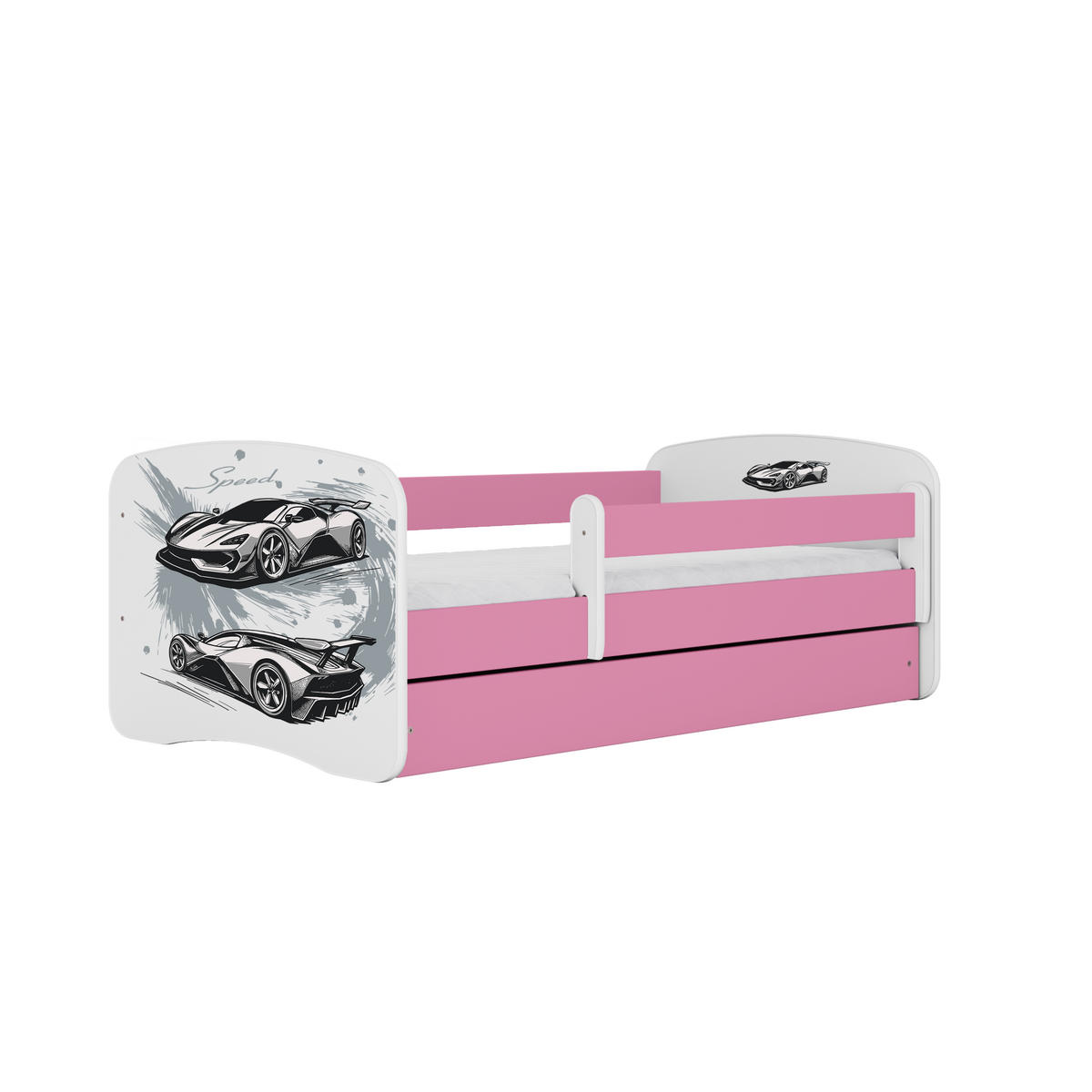 Das Kinder-/Jugendbett ("160/80 cm) in Rosa mit dem Motiv „Sportwagen “ von Raumhirsch bringt eine moderne, gemütliche Atmosphäre in ein Kinder- oder Jugendzimmer. Mit seinem markanten Design und dem geschwungenen Kopf- und Fußteil schafft es eine beruhigende Umgebung, die durch die neutrale Farbgebung noch verstärkt wird.Besonders praktisch ist die abnehmbare Schutzschiene, die sowohl rechts als auch links angebracht werden kann und für die Sicherheit kleiner Kinder sorgt. Das Bett verfügt außerdem über eine unterteilte Schublade, in der Bettwäsche, Kissenbezüge und Decken verstaut werden können – ideal, um Ordnung im Zimmer zu schaffen.Im Lieferumfang enthalten ist ein Lattenrost mit einer manuell verstellbaren Mittelzone für eine bequeme Liegeposition. Dieses teilmassive Kinder-/Jugendbett ("160/80 cm) in Rosa verleiht dem Kinderzimmer einen modernen und stilvollen Look. Bettzeug und Dekoration sind nicht im Preis enthalten.