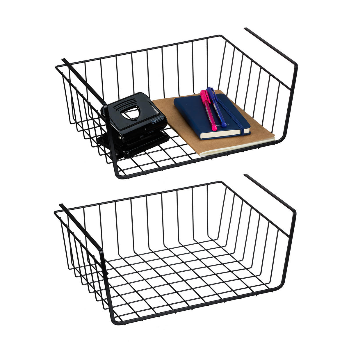 Dieses praktische Hängekorbregal im 2er Set bietet vielfältige Einsatzmöglichkeiten für eine platzsparende Aufbewahrung. Die schwarzen Drahtkörbe lassen sich mühelos an Regalen, Schränken oder Schreibtischen einhängen und schaffen so zusätzlichen Stauraum. Dank des robusten Eisendrahts sind die Hängekörbe stabil und langlebig. Ihr modernes Design fügt sich harmonisch in viele Einrichtungsstile ein. Ideal für die Organisation von Büromaterial, Küchenutensilien oder anderen Kleinigkeiten.