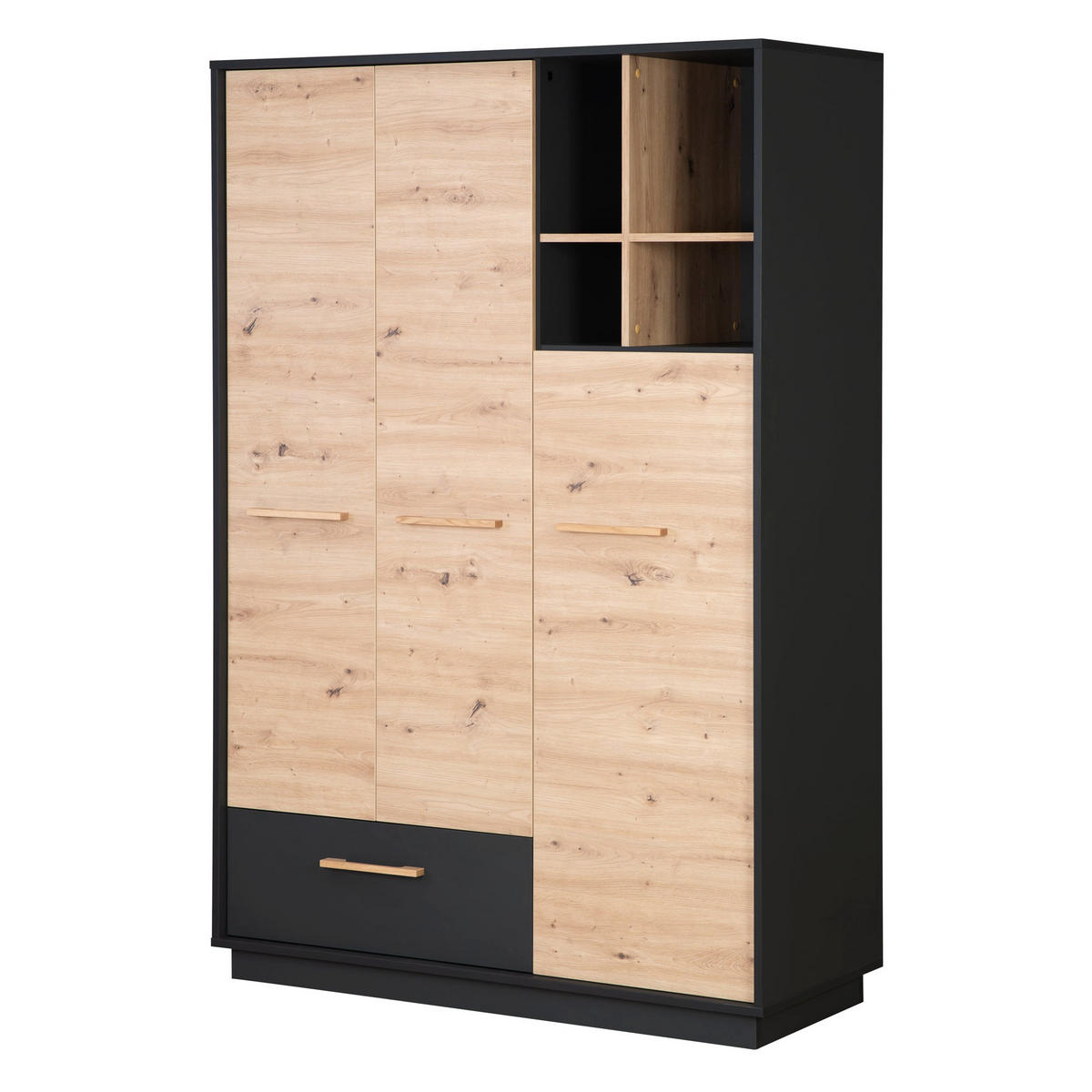 - Materialzusammensetzung: Korpus: Spanplatte (melaminbesch.), Fronten: Spanplatte (melaminbesch.), Rückwand: HDF, Böden: Spanplatte (melaminbesch.), Griffe: Massivholz, Kleiderstange: Metall