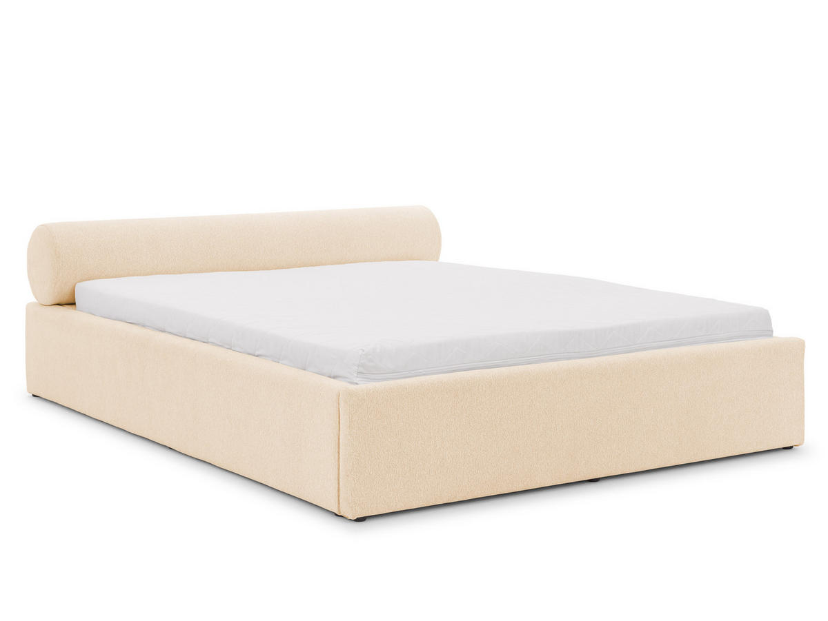 Dieses stilvolle Bett kombiniert modernes Design mit höchster Funktionalität. Der komfortable Bettrahmen bietet eine angenehme Einstiegshöhe und das Designer-Kopfteil in Form einer Rolle ist mit Schaumstoff gepolstert – perfekt zum Anlehnen und Entspannen.