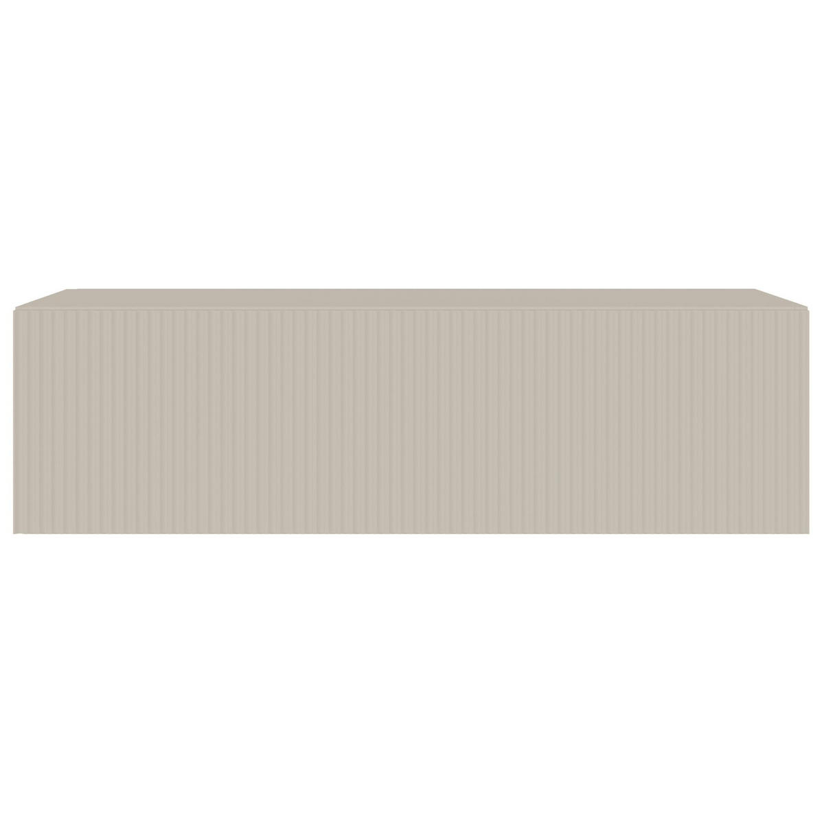 Ein besonderes Highlight sind die stilvollen geriffelten Fronten, die dem Möbel eine moderne, taktile Struktur verleihen. Hinter der praktischen, nach unten öffnenden Tür verbergen sich zwei geräumige Fächer. So können Sie Ihre gesamte Technik, Kabel und Medienkollektion mühelos und unsichtbar verstauen – für ein stets aufgeräumtes und harmonisches Wohnambiente.