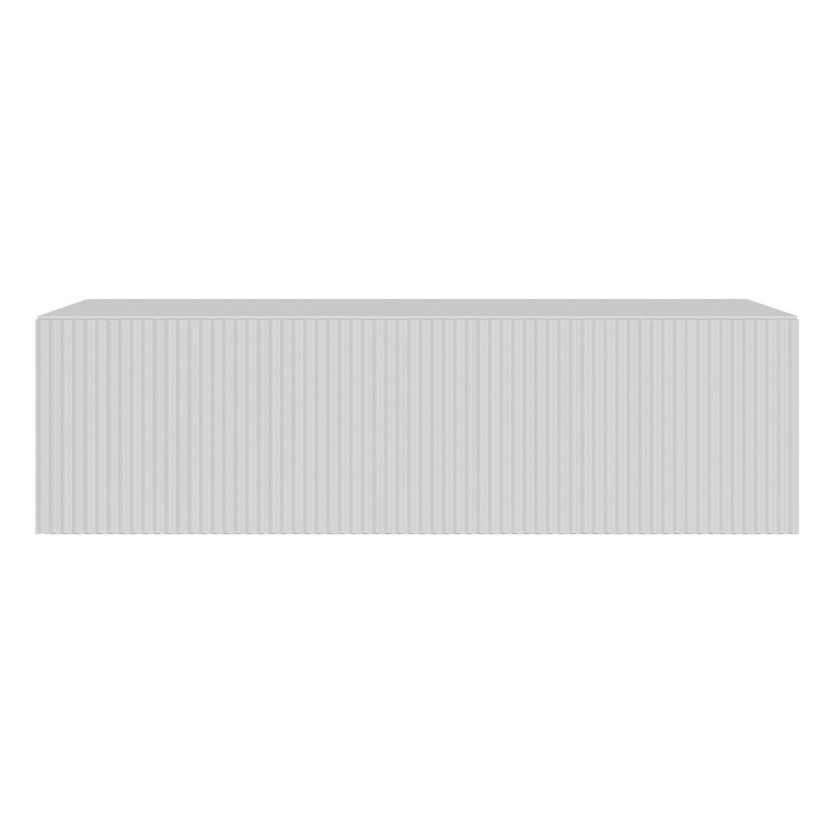 Ein besonderes Highlight sind die stilvollen geriffelten Fronten, die dem Möbel eine moderne, taktile Struktur verleihen. Hinter der praktischen, nach unten öffnenden Tür verbergen sich zwei geräumige Fächer. So können Sie Ihre gesamte Technik, Kabel und Medienkollektion mühelos und unsichtbar verstauen – für ein stets aufgeräumtes und harmonisches Wohnambiente.