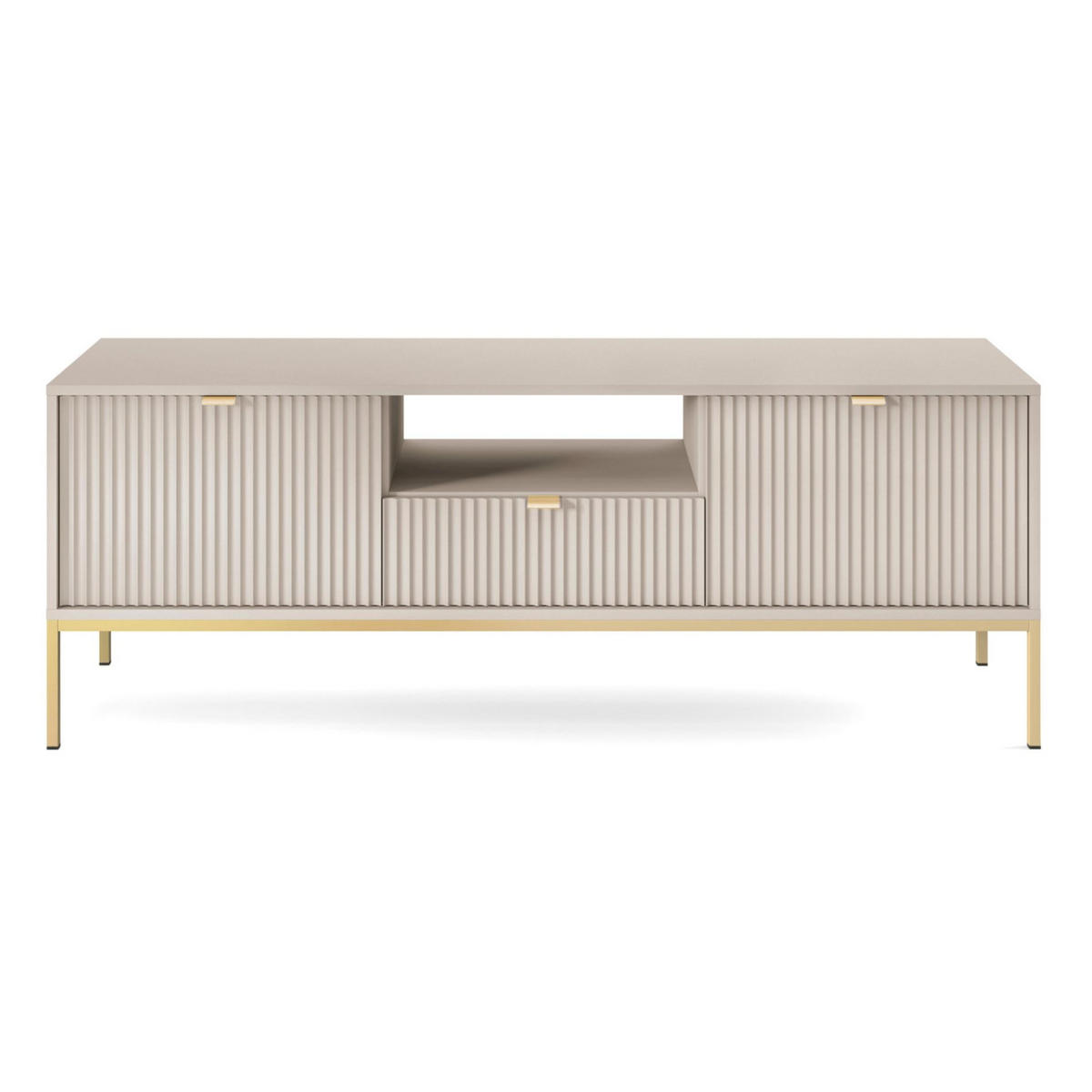 Das TV-Lowboard Vellore vereint modernen, minimalistischen Stil mit eleganten Details. Seine klaren Linien und das geometrische Design des Gestells schaffen eine zeitlose Ästhetik, die in jedes Zuhause passt. Der Korpus und die Fronten des Schrankes sind in einem hellen, sanften Greige gehalten und harmonieren wunderbar mit verschiedenen Einrichtungsstilen. Ein glänzendes Gestell in Gold setzt dazu einen edlen Akzent. Die geriffelten Fronten verleihen dem Lowboard zusätzliche Tiefe und Struktur, während die schmalen, goldenen Griffe das Design abrunden und den luxuriösen Charakter unterstreichen.