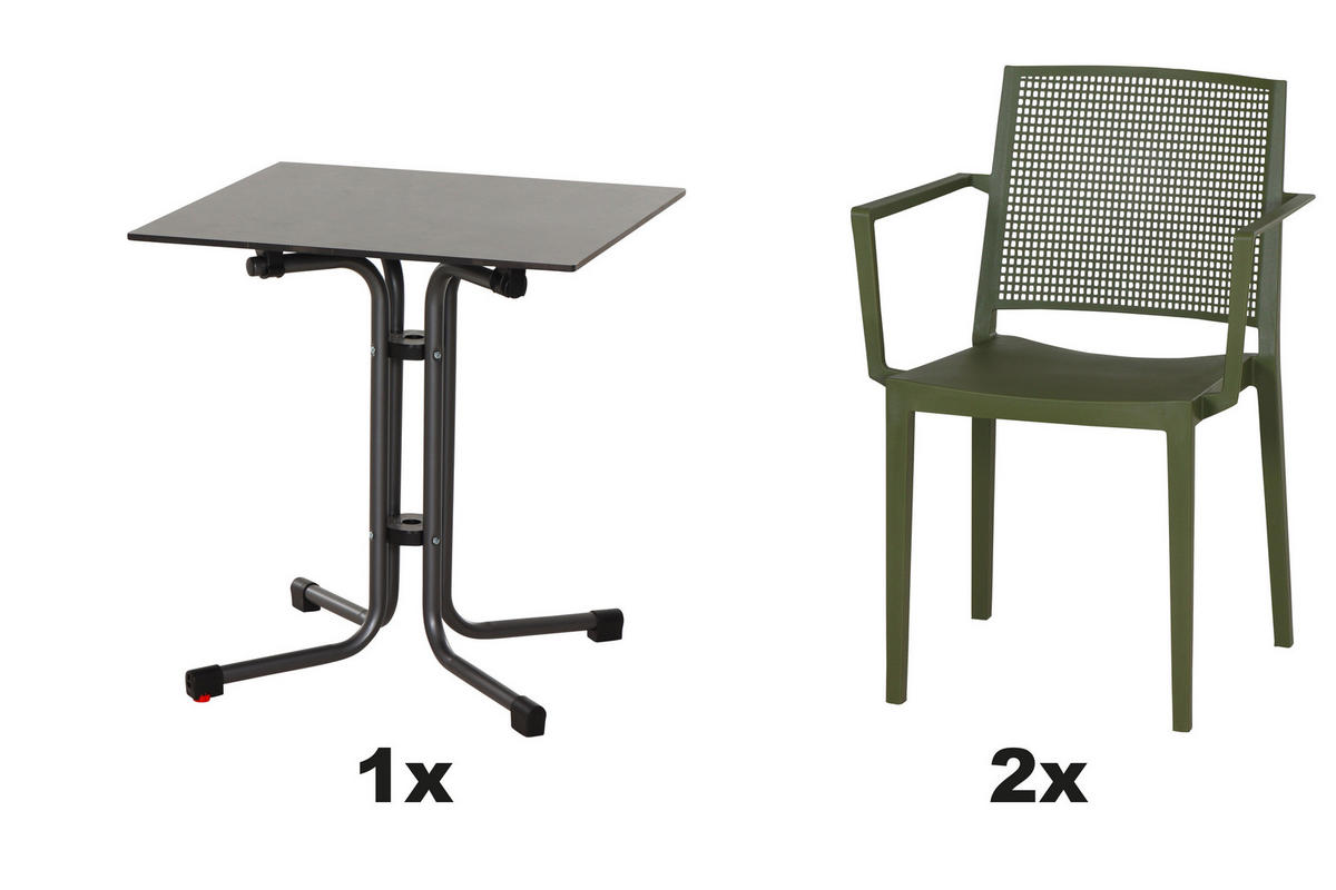 - Besonderheiten: Tisch klappbar, gastro- und objekttauglich, wetterbeständig, Stühle stapelbar
