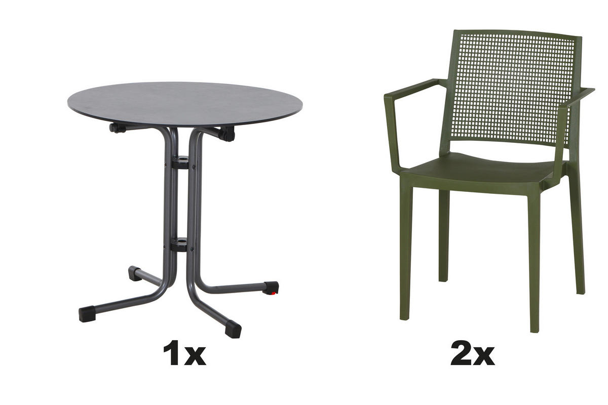 - Besonderheiten: Tisch klappbar, gastro- und objekttauglich, wetterbeständig, Stühle stapelbar
