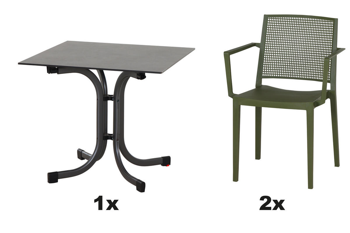 - Besonderheiten: Tisch klappbar, gastro- und objekttauglich, wetterbeständig, Stühle stapelbar