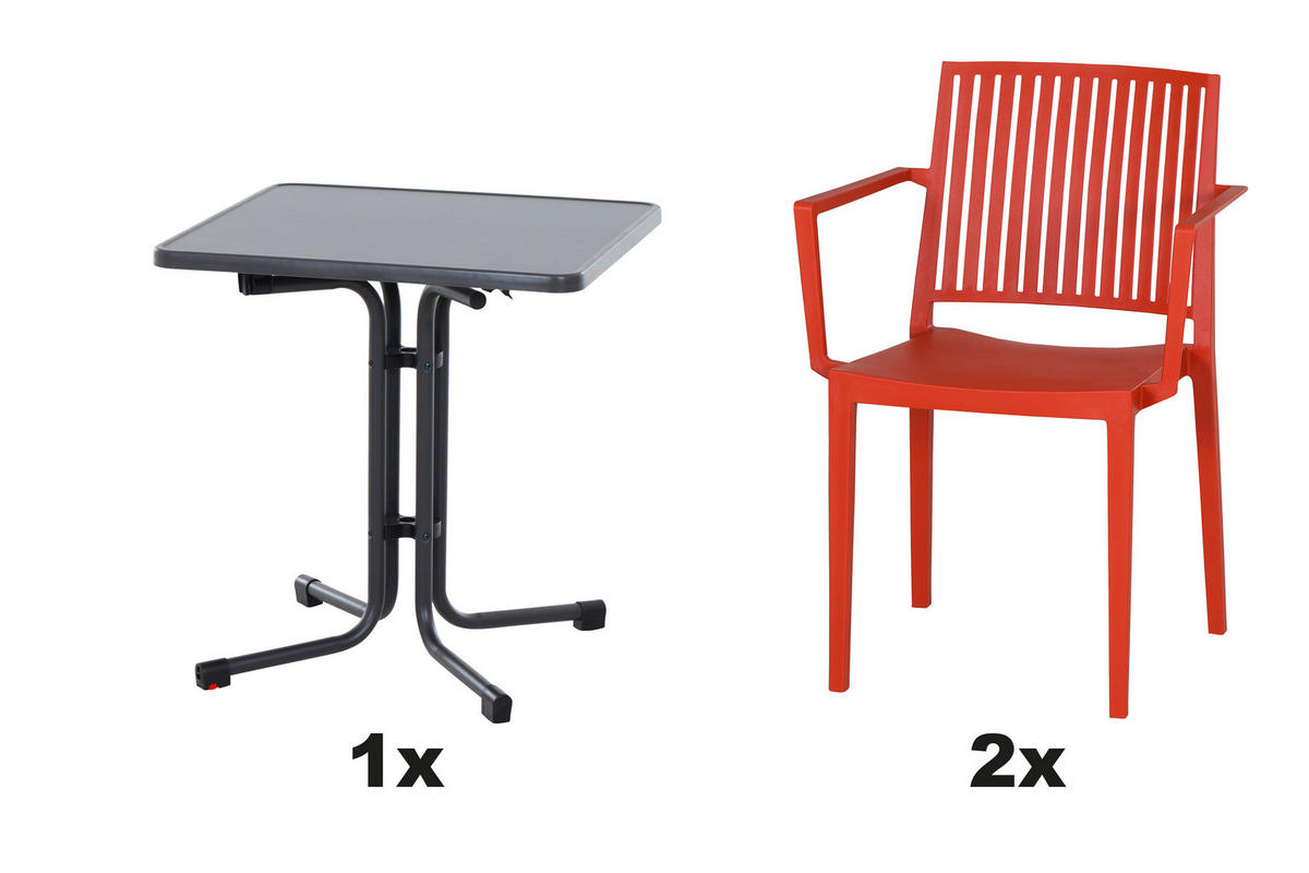 - Besonderheiten: Tisch klappbar, wetterbeständig, Stühle stapelbar, geeignet für Balkon