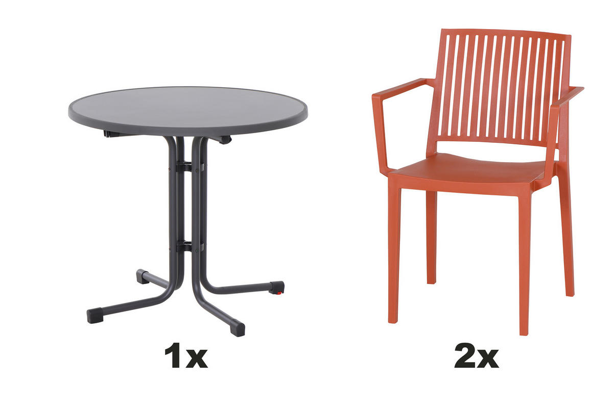 - Besonderheiten: Tisch klappbar, UV-beständig, wetterbeständig, Stühle stapelbar