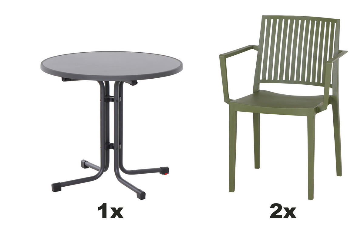 - Besonderheiten: Tisch klappbar, UV-beständig, wetterbeständig, Stühle stapelbar