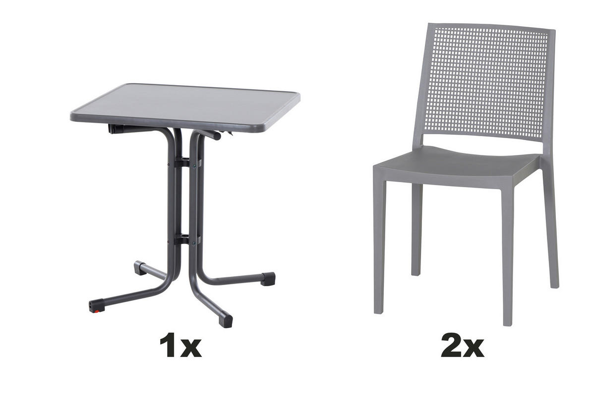 - Besonderheiten: Tisch klappbar, wetterbeständig, Stühle stapelbar, geeignet für Balkon
