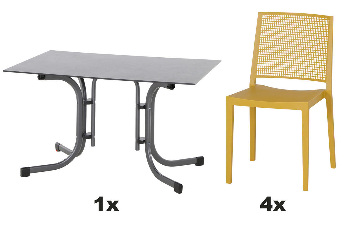 - Besonderheiten: Tisch klappbar, gastro- und objekttauglich, wetterbeständig, Stühle stapelbar