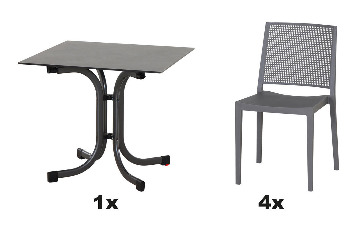 - Besonderheiten: gastro- und objekttauglich, wetterbeständig, Stühle stapelbar