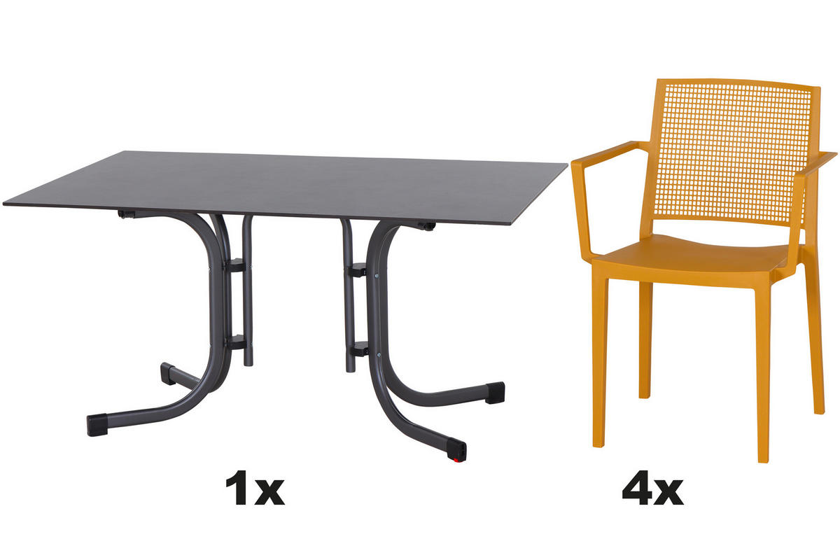 - Besonderheiten: Tisch klappbar, gastro- und objekttauglich, wetterbeständig, Stühle stapelbar