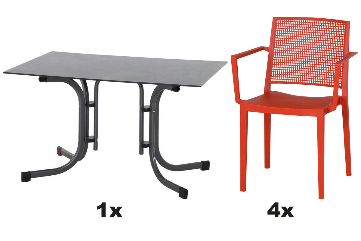 - Besonderheiten: Tisch klappbar, gastro- und objekttauglich, wetterbeständig, Stühle stapelbar