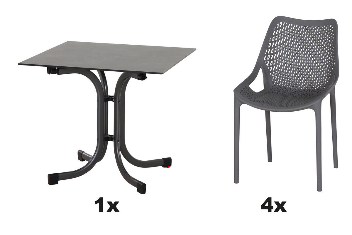 - Besonderheiten: Tisch klappbar, gastro- und objekttauglich, wetterbeständig, Stühle stapelbar