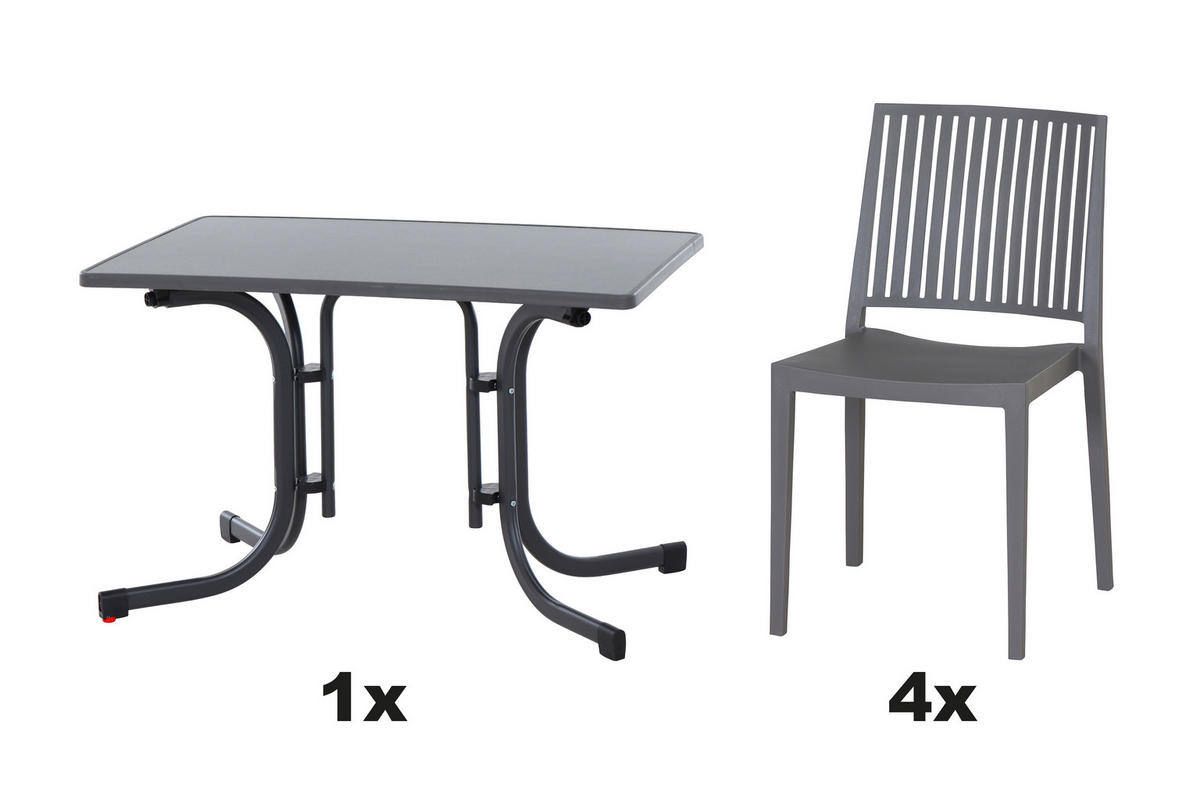 - Besonderheiten: Tisch klappbar, UV-beständig, wetterbeständig, Stühle stapelbar