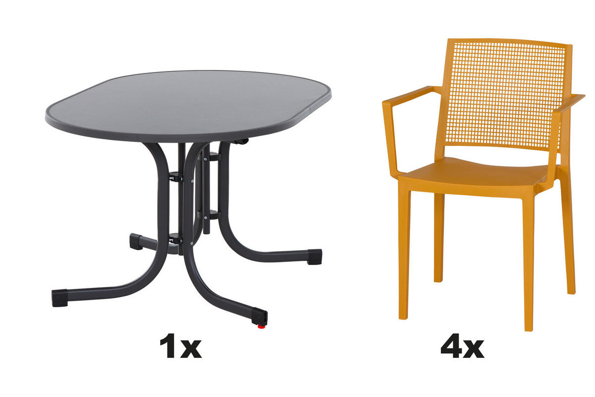 - Besonderheiten: Tisch klappbar, gastro- und objekttauglich, regenabweisend, wetterbeständig, wetterfest, Stühle stapelbar, platzsparend verstaubar