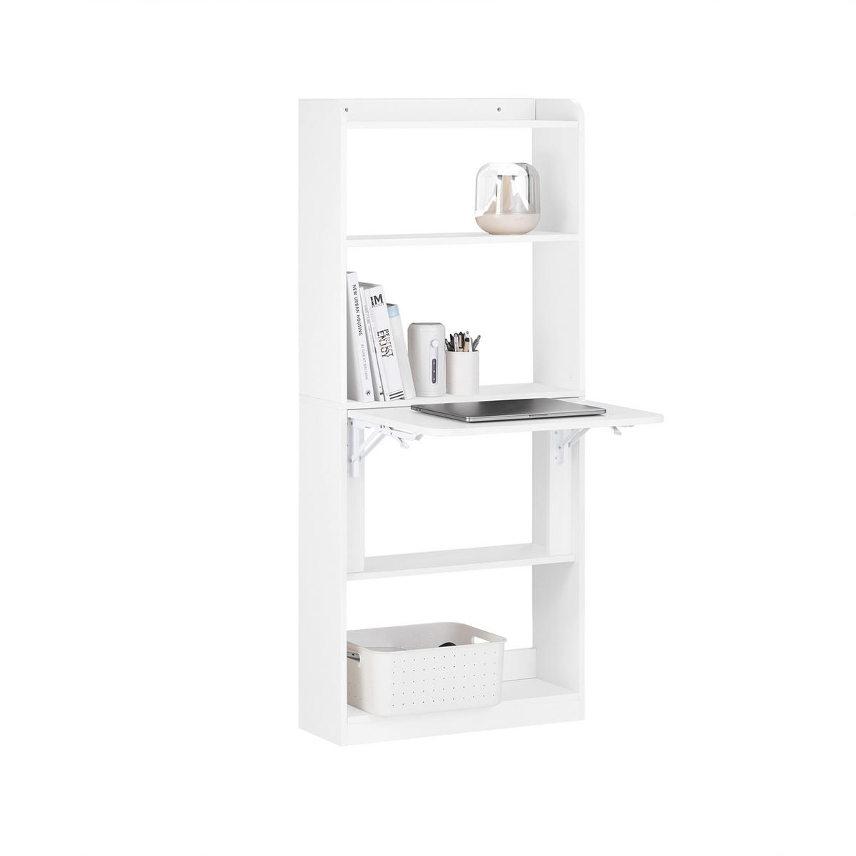 Dieser multifunktionale Schreibtisch kann im erweiterten Zustand als Laptop-Schreibtisch oder im zusammengeklappten Zustand als Regal verwendet werden.