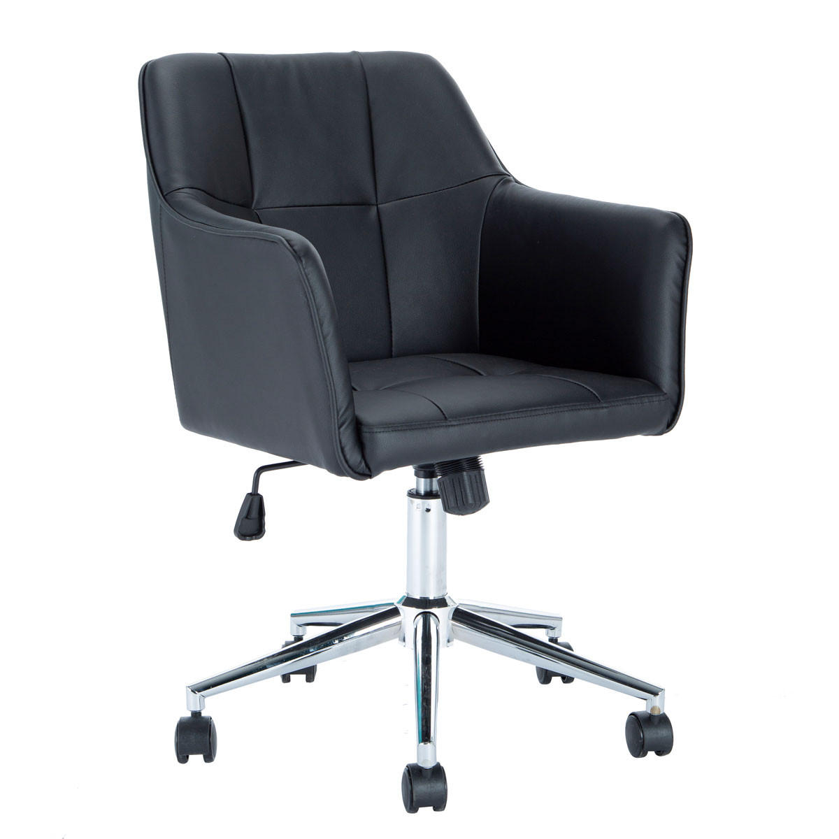 Die angenehm hohen Armlehnen, die gepolsterte Sitzfläche und die Rückenlehne sind mit einem Bezug aus Kunstleder versehen und sorgen für besonders hohen Komfort. Reinigen lässt sich der Drehstuhl ganz einfach mit einem feuchten Tuch.
