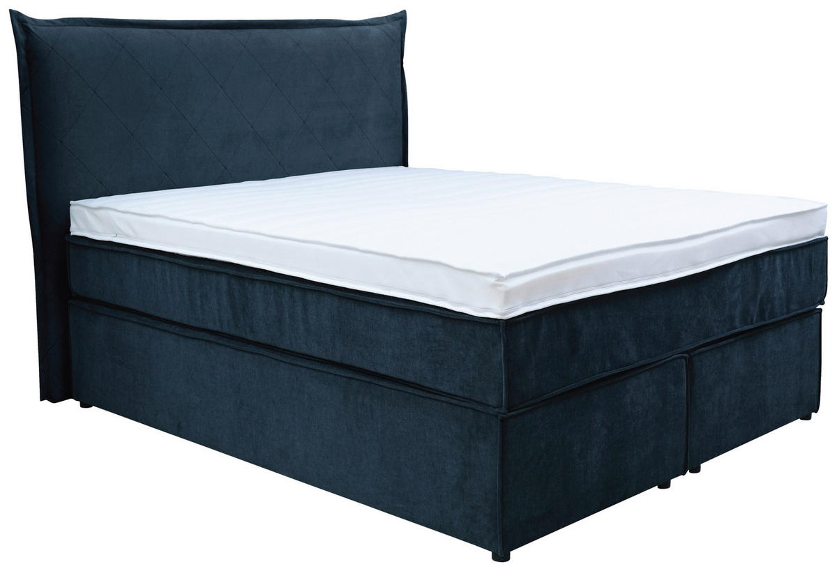 Ziersteppung gibt dem Möbelstück den dekorativen Feinschliff. Realisieren Sie ein wunderbares Schlafzimmer-Upgrade mit diesem Boxspringbett (ca. 140 x 200 cm) in Dunkelblau inklusive Matratze, Topper und gepolstertem Kopfteil – weil Qualität und Ästhetik keine Kompromisse brauchen!